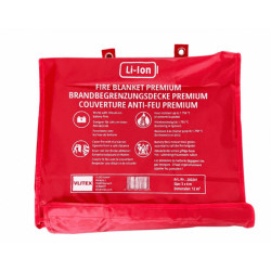 Material: Tejido de fibra de vidrio con revestimiento de silicona en ambas caras, resistente a ácidos y productos químicos Ajuste: hilo de coser ignífugo para una máxima estabilidad Correa de sujeción y asa: de fibra de vidrio recubierta de silicona para facilitar su uso Resistencia a la temperatura: de forma duradera hasta 1.000°C, e incluso hasta más de 1.750°C durante un breve periodo Mantenimiento: sin mantenimiento - resistente a la intemperie y a la corrosión Tamaño y peso: 3x4m compacto por sólo unos 6,6kg Adecuación: Especialmente diseñado para fuegos de iones de litio de dispositivos de litio superior-medio tales como bicicletas eléctricas, máquina de limpieza, e-chopper, caja de paletas, carrito de golf, carretilla elevadora eléctrica...; pero por supuesto también utilizable como una manta de fuego para fuegos tradicionales. Recomendado para: Uso preventivo o dirigido por bomberos y organismos de seguridad en caso de incendio de baterías; uso como manta ignífuga en caso de incendio tradicional.