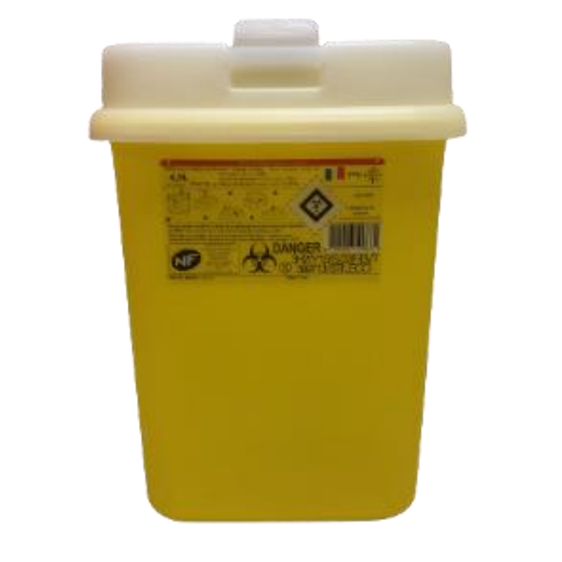La tapa está equipada con un canalón de seguridad; tiene una gran abertura (90x45mm) y tapas de liberación de agujas, incluyendo una especialmente diseñada para puntas de plumas de insulina/adrenalina.