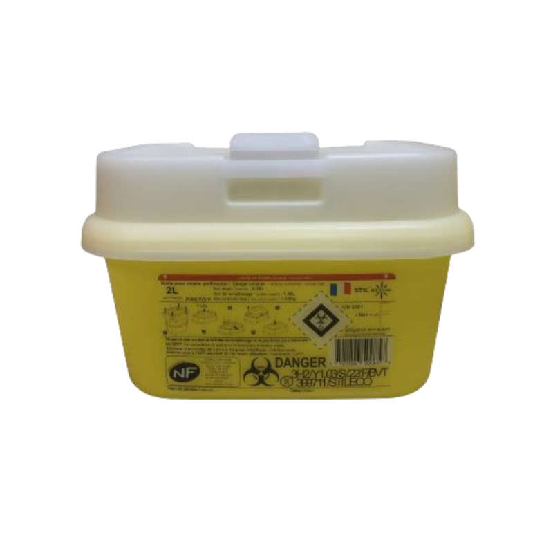 La tapa está equipada con un canalón de seguridad; tiene una gran abertura (90x45mm) y tapas de liberación de agujas, incluyendo una especialmente diseñada para puntas de plumas de insulina/adrenalina.